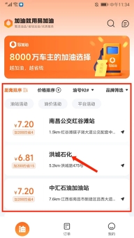 1. 开启易加油app,进入【油】页面,便能看到当前周边加油站的油价、距离以及优惠等相关信息。在此以“洪城石化”为例。