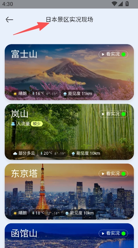 1、打开软件,进入日本景区实况现场,浏览富士山、岚山等景区列表。