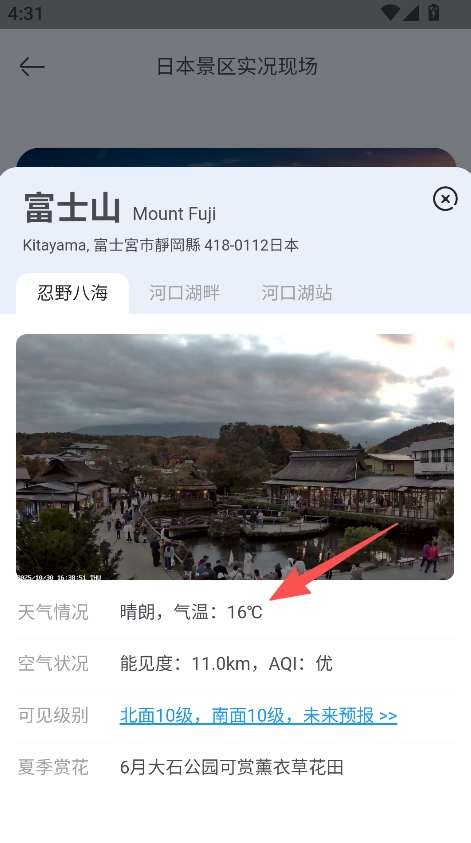 2、选择富士山,查看天气情况(如晴朗、气温16℃)。
