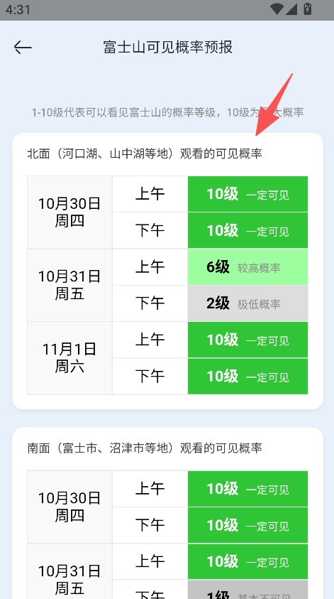 3、进入富士山可见概率预报,查看未来几日可见等级,规划游览时间。